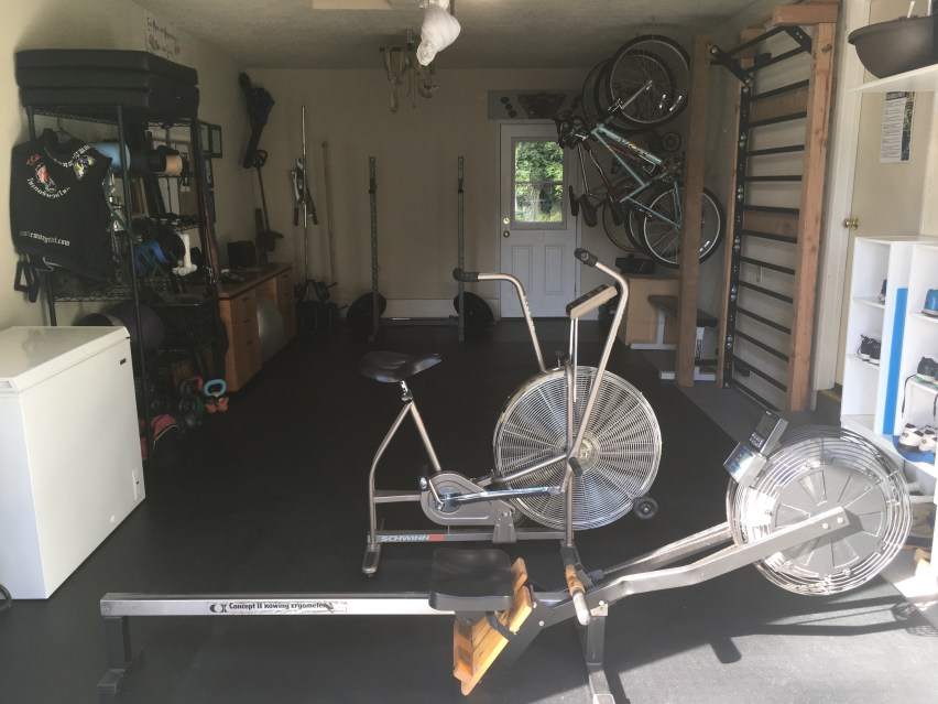 That’s where I am now; in my garage, surrounded by exercise equipment, sore from this morning’s 5am training session, with a full belly from a serious post-workout meal, happy as can be.