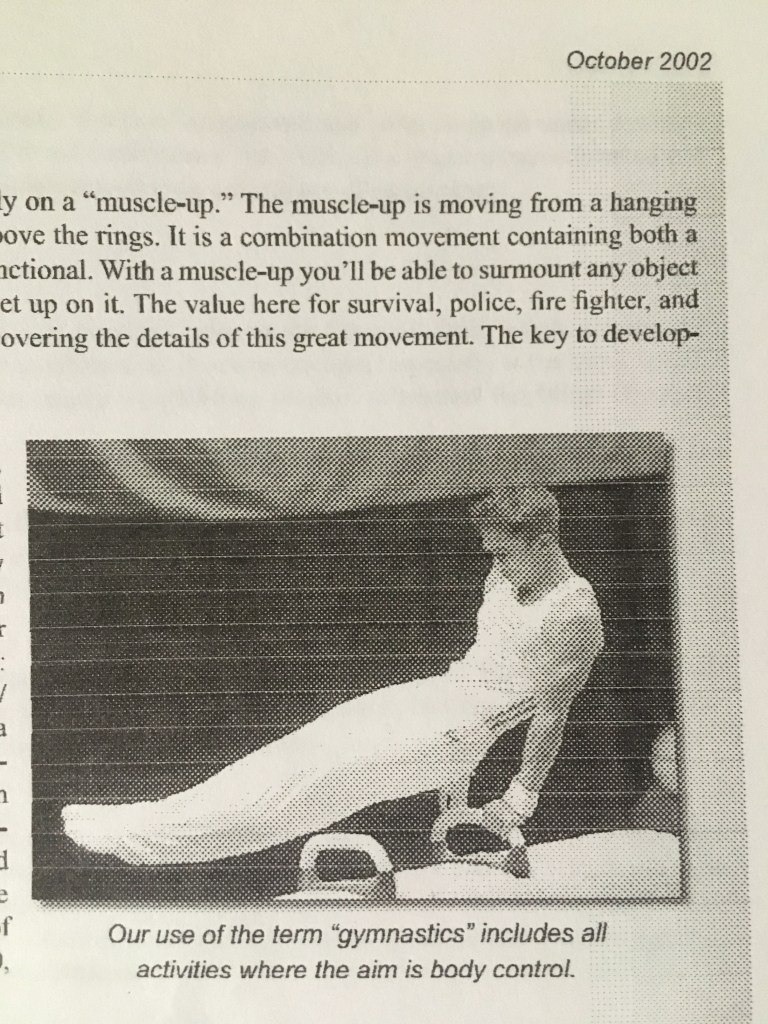 When Greg talks about gymnastics here, he’s including a whole range of disciplines whose aim is body control. Climbing, Yoga, Calisthenics, Dance, it’s an interesting collection of activities. I used this concept for a long time, but now I don’t think it’s honoring any of these individual disciplines to lump them all under “gymnastics”, except for Calisthenics, which is definitely a component of gymnastics. But, Climbing, Yoga, and Dance are really their own things with no relationship to Gymnastics. The umbrella category of “body control” or “movement disciplines” might be more accurate.