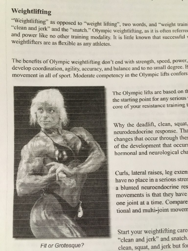 On the other hand (and of course there has to be an “on the other hand”, doesn’t there?), he says some things in this section that are just flat-out wrong. Let’s start with “these movements are the starting points for any serious weight-training program,” and, “they should serve as the core of your resistance training throughout your life.” Consider those statements in the eyes of a completely untrained, 45 year-old call-center operator. The starting point for their weight-training program DOES NOT, CANNOT, and SHOULD NOT include cleans & jerks. Trust me. I have put a lot of gen pop (general population) through weight training programs over the years. Many of them actually need to start with bodyweight movements, then very simple lifts, and–dare I say–bodybuilding techniques long before they are ready for complex, coordinated actions like cleans & jerks. Taking someone with no proper motor-control patterns for the hinge movement and asking them to clean a barbell is a recipe for disaster. They might have years of waiter’s bows, good mornings, and deadlift variations in their future before they’re ever ready to try the clean. Same goes for the jerk.