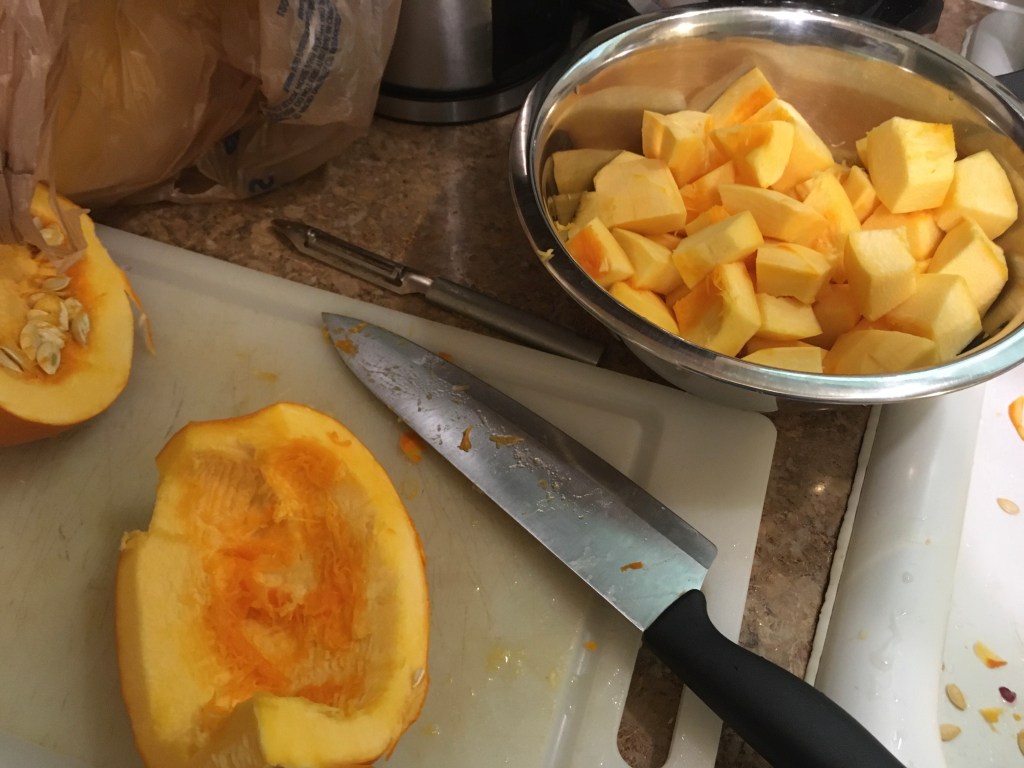 I stand against the wasteful carving of pumpkins into jack-o-lanterns at Halloween. Every time I see a yard full of rotting pumpkins, I think about the people in our city streets without food, the working people whose families don’t have enough for all the hungry mouths, and those living in places of famine or food shortage. Pumpkins are for food. So, here is a simple pumpkin recipe I made this week.