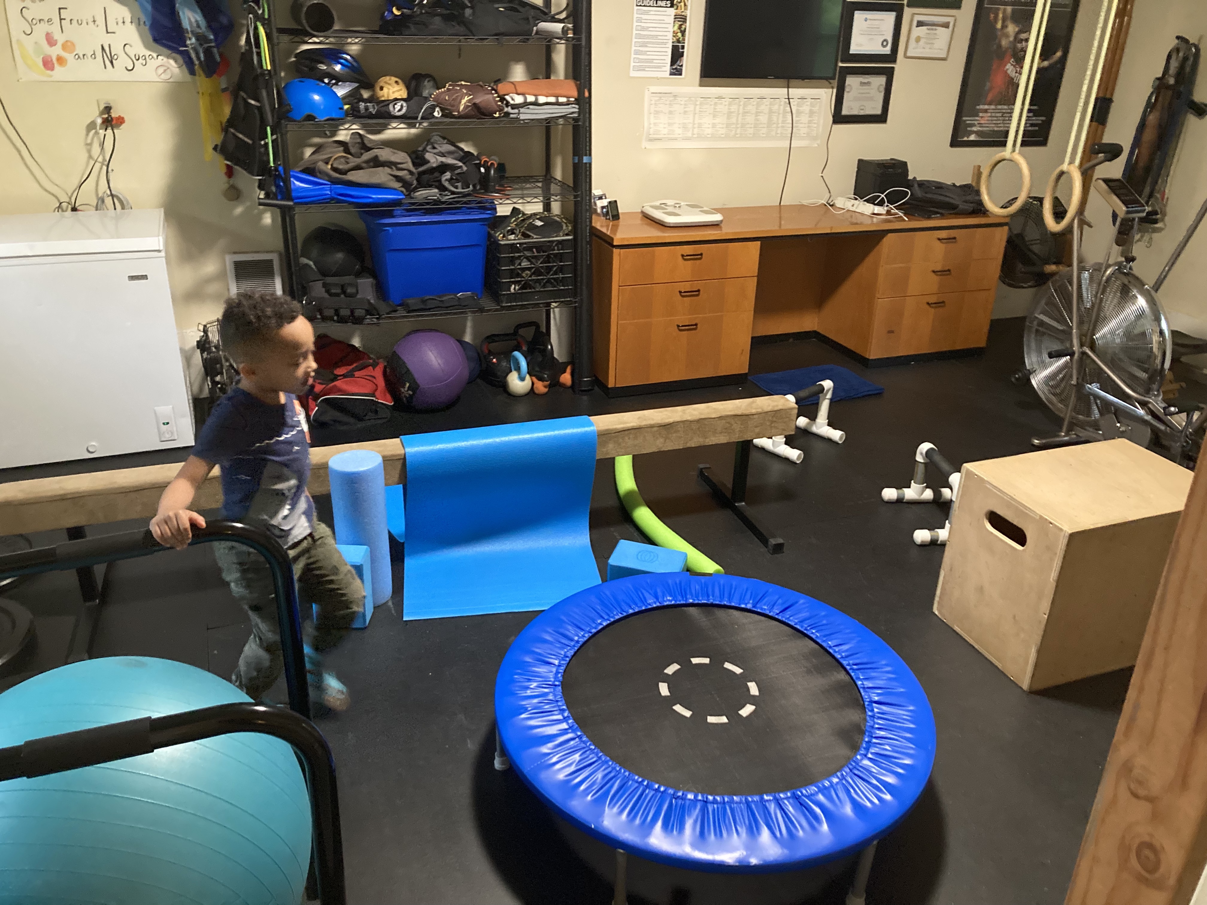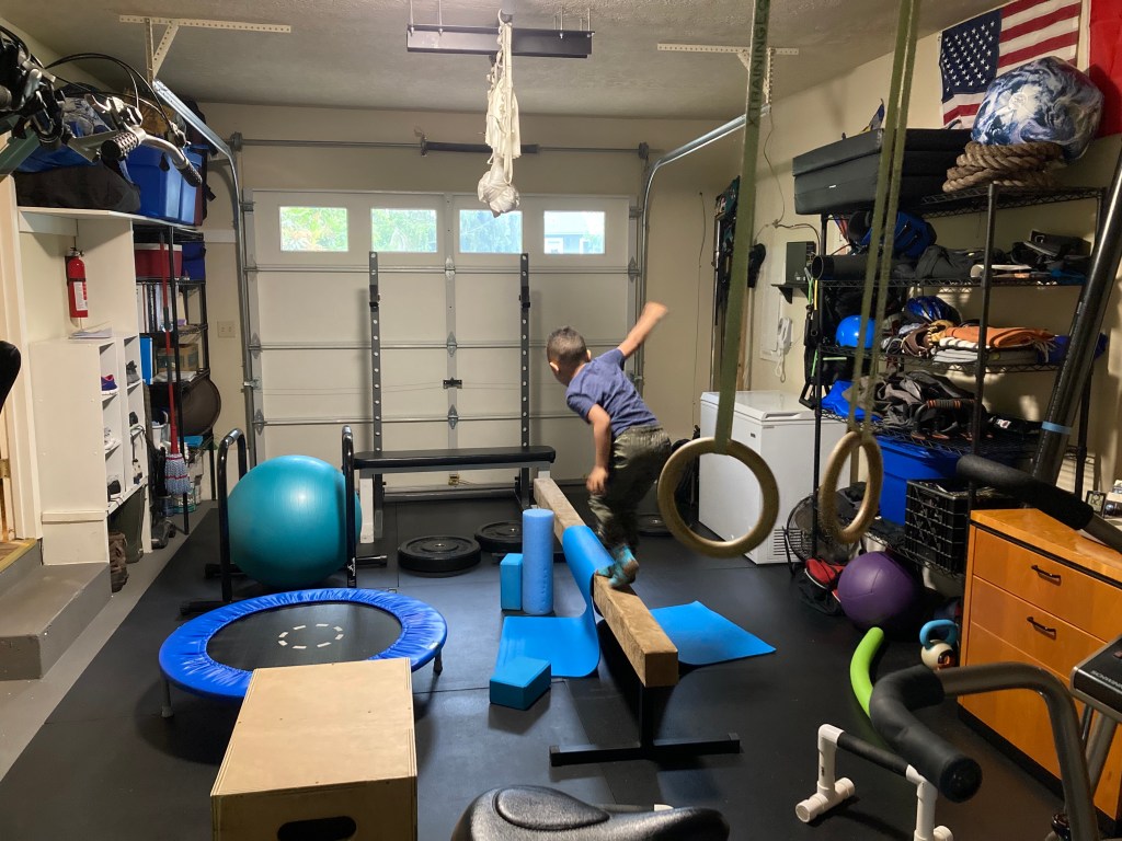 This is Obstacle Course Day at the Smart, Fit, and Clean gym (otherwise known as my garage). That’s little Nathan and this is his favorite thing to do in the gym: drag everything out and set up a bunch of wacky challenges for himself. There are dip bars and yoga balls to climb over, trampolines to jump on, boxes to climb, and rings to swing from. It’s Heaven for a kid.