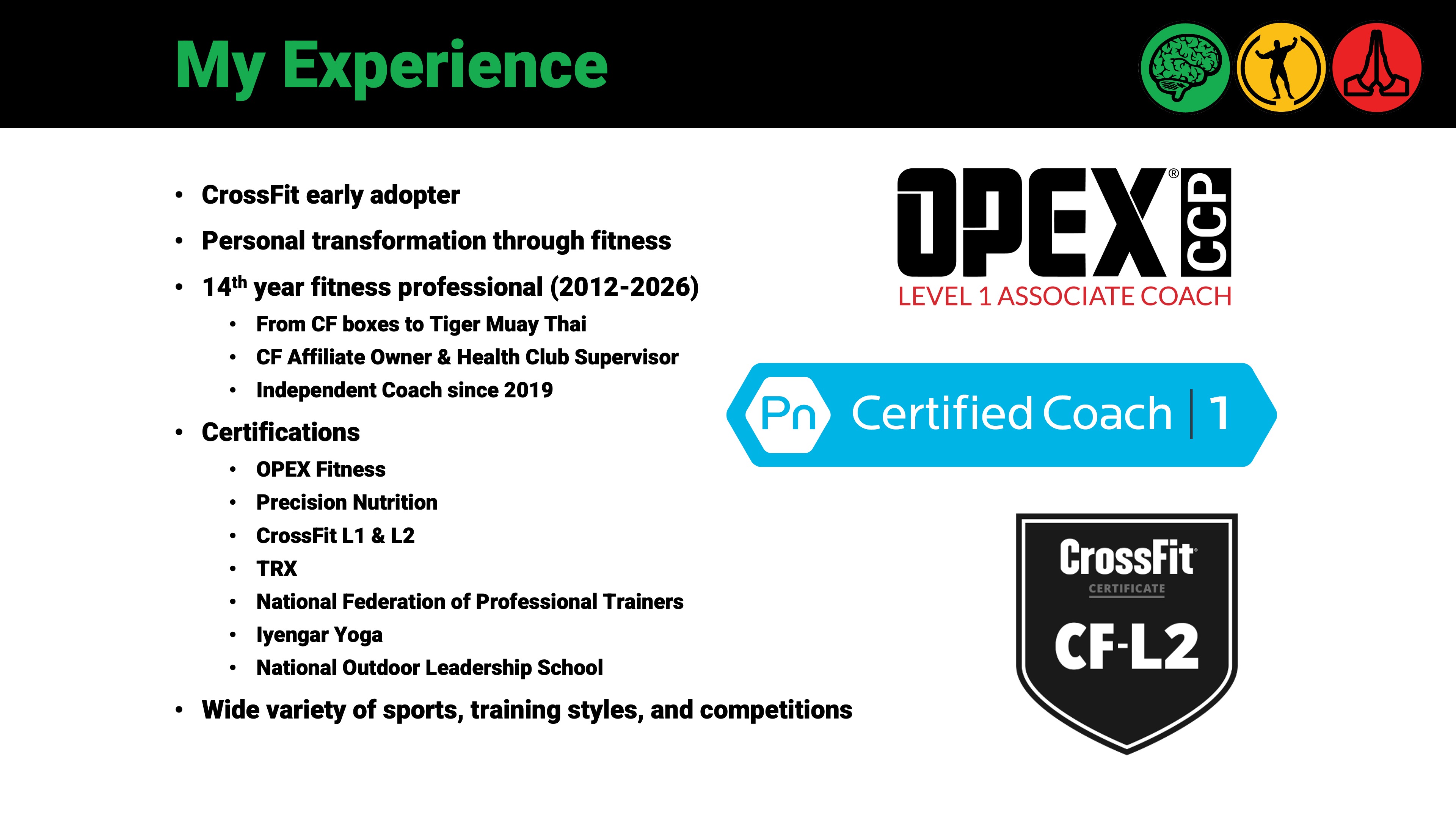 Over the years, I participated in a vast array of sports and fitness modalities, such as street workouts, logging sports, various martial arts, obstacle course races, and the Highland Games. I added to my knowledge with certifications from CrossFit, Iyengar Yoga, NFPT, TRX, Precision Nutrition, and what I consider to be the crown-jewel: the OPEX Coaching Certificate Program. This program taught me about Individual Design Coaching, the model I practice today with my clients.